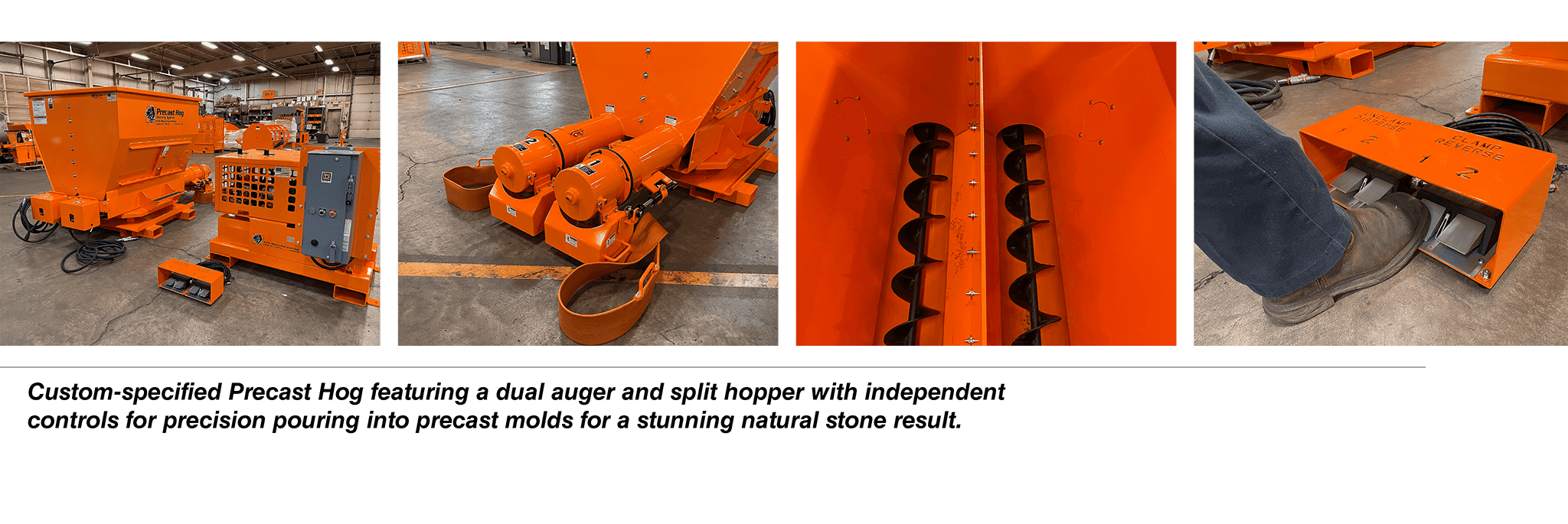 One of the standout features of the EZG Precast Hog is its innovative dual auger system. This split hopper design allows you to independently control two different concrete mixes, enabling the creation of custom blends that achieve the perfect color and texture. Whether you’re replicating the look of natural stone or experimenting with unique design elements, the Precast Hog ensures consistency across every batch, reducing the variability often associated with manual mixing.