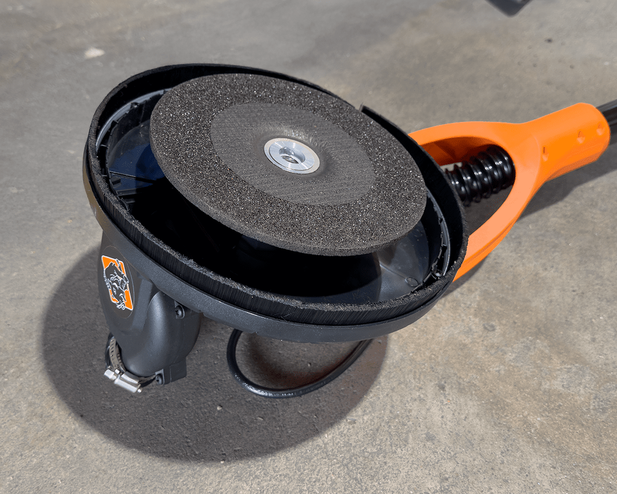 Operable with either cupped or 7" flat abrasive disc